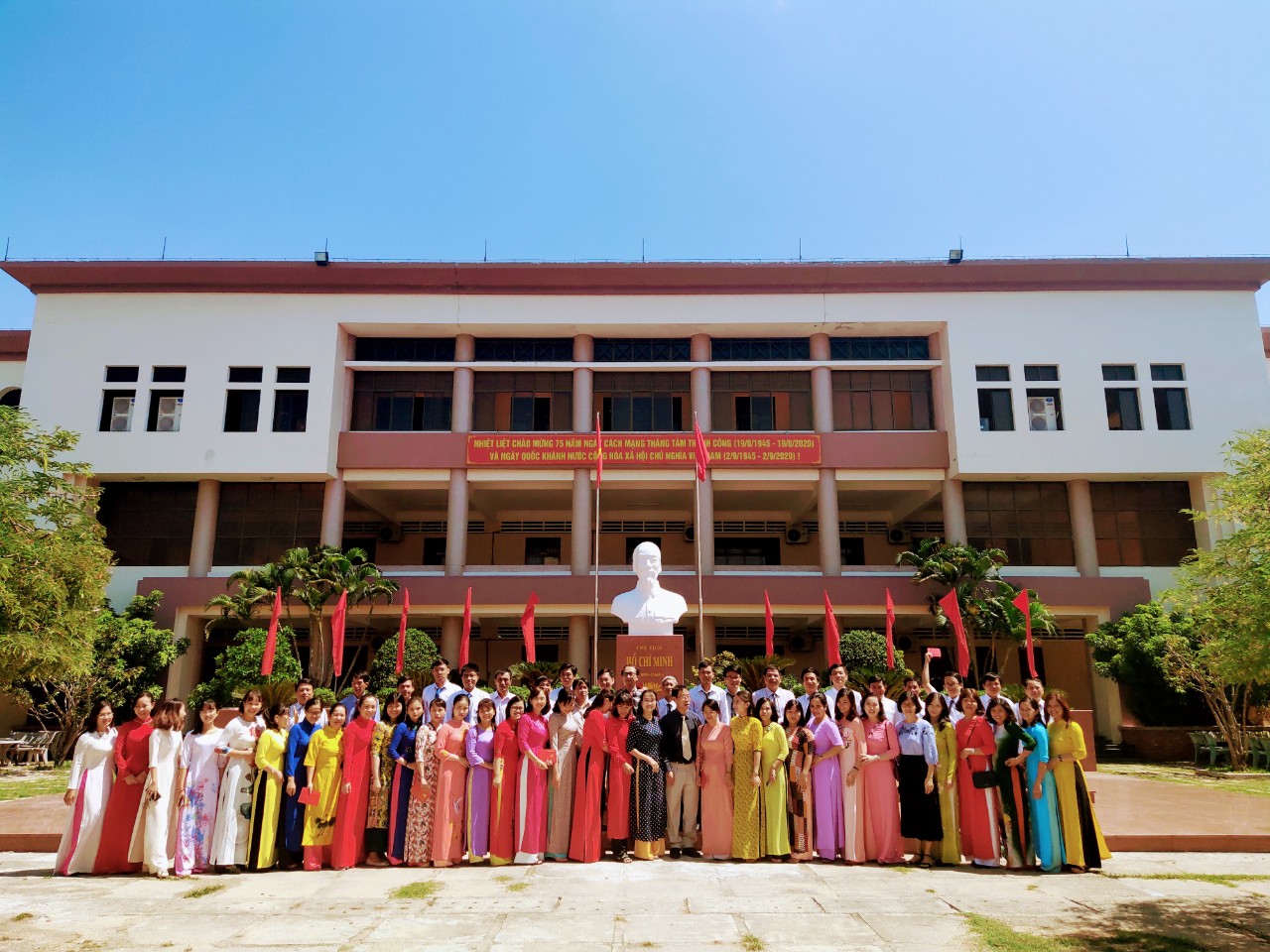Tập thể lớp chụp ảnh lưu niệm với cán bộ nhà trường trước tượng Bác Hồ